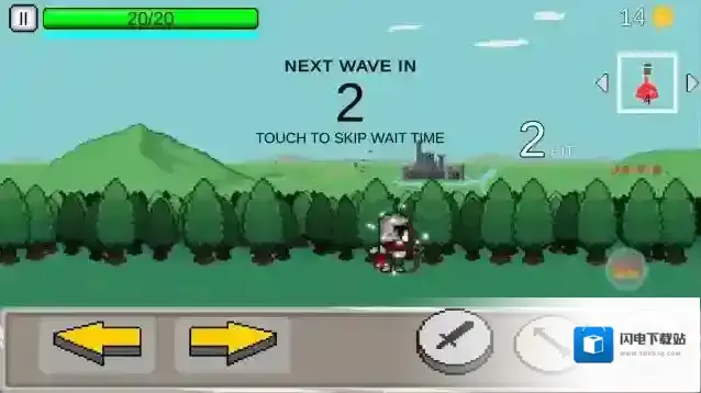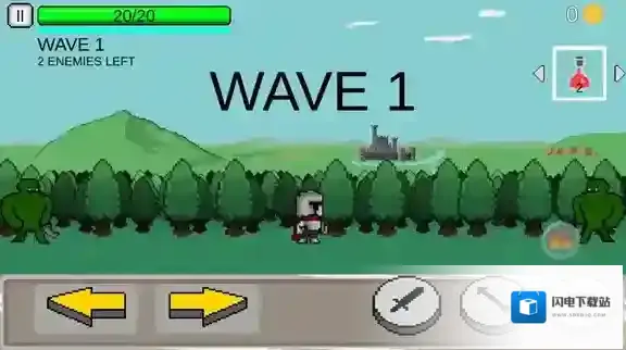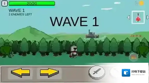2、进入关卡后点击左侧的按钮控制角色移动,右侧的按钮是使用长剑、弓箭、防御。