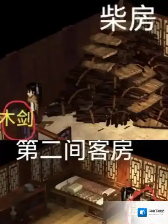 被李大娘叫醒,捡完屋内装备并装上后出门触发剧情,完事下楼看见臭道士,与婶婶对话,去厨房把酒菜端给二楼苗人,他们不要酒整好拿去给臭道士喝(esc-物品-使用-桂花酒),道士没钱,但承诺今晚三更十里坡教逍遥剑法。去厨房与婶婶对话,要我们去买虾。