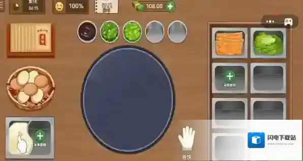 3、进入煎饼制作界面,点击左侧食材,按步骤添加至煎锅,搭配右侧生菜等食材,完成经典煎饼制作,交付订单。
