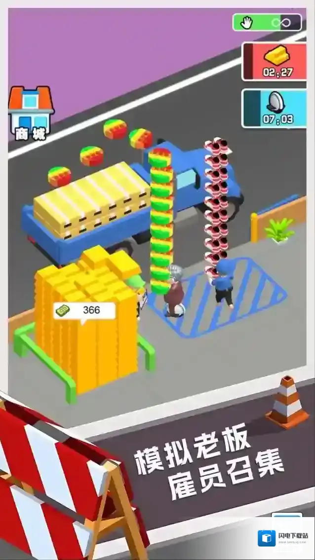 2、进入经营场景,关注卡车旁堆叠的货物,利用倒计时及时处理,点击商城补充资源,维持运营。