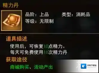 4、精力丹是恢复精力值的重要道具,使用后可恢复角色10点精力值。精力丹的获取来源包括每日累计活动以及完成江湖录任务。