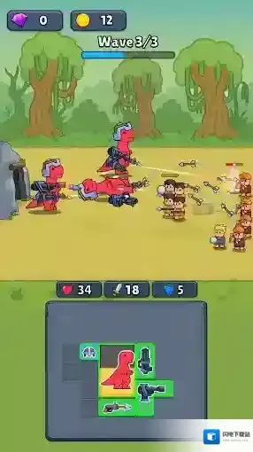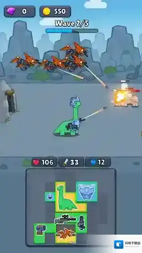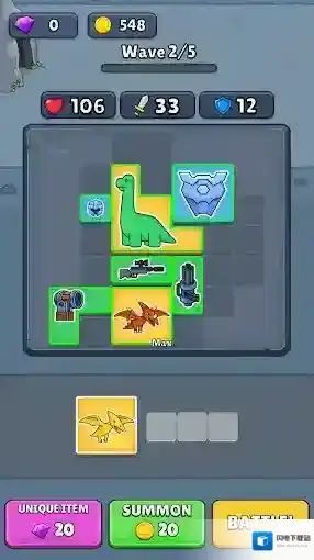 1、在网格上排列你的恐龙和武器,将它们正确排列,并聚集你不可阻挡的恐龙军队,还能装备上武器,去消灭出现的敌人。