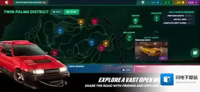3、点击左上角可以打开游戏地图,在地图上你可以看到不同的比赛地点和汽车商店。